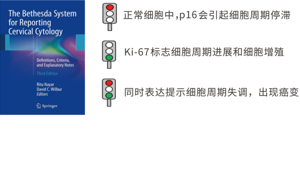 正常细胞中,p16和Ki-67表达相互拮抗。若两种蛋白在同一个细胞表达,则提示为细胞周期失调,出现癌变。因此,p16/Ki-67双染可用于检测宫颈癌前病变。